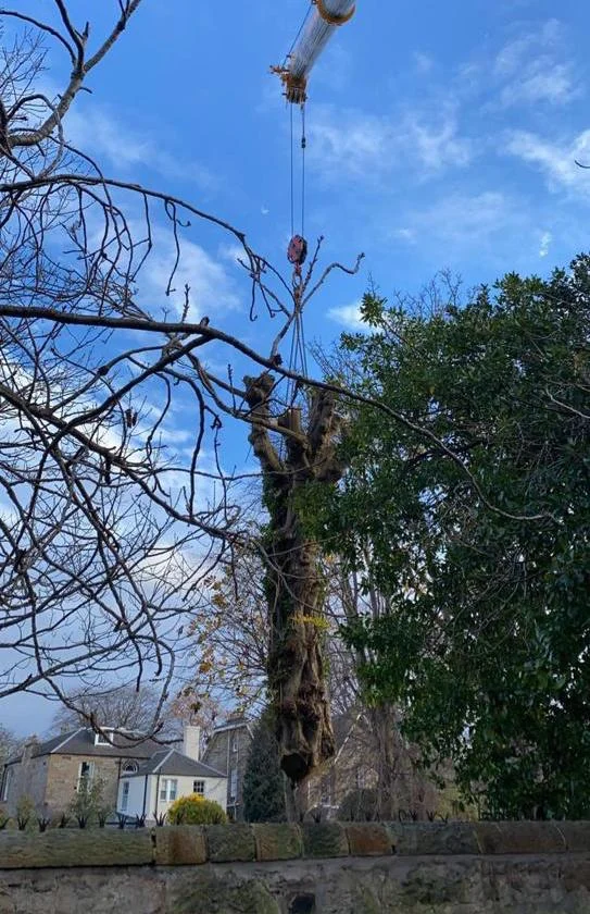 This large Chestnut tree felling in Edinburgh presented several challenges for our team to overcome. Not only was it was situated in a landlocked urban garden, but it was also severely decayed meaning any aerial climbing had to be approached with caution. The obvious method to remove the tree in this instance was by employing the use of a 40ft crane.